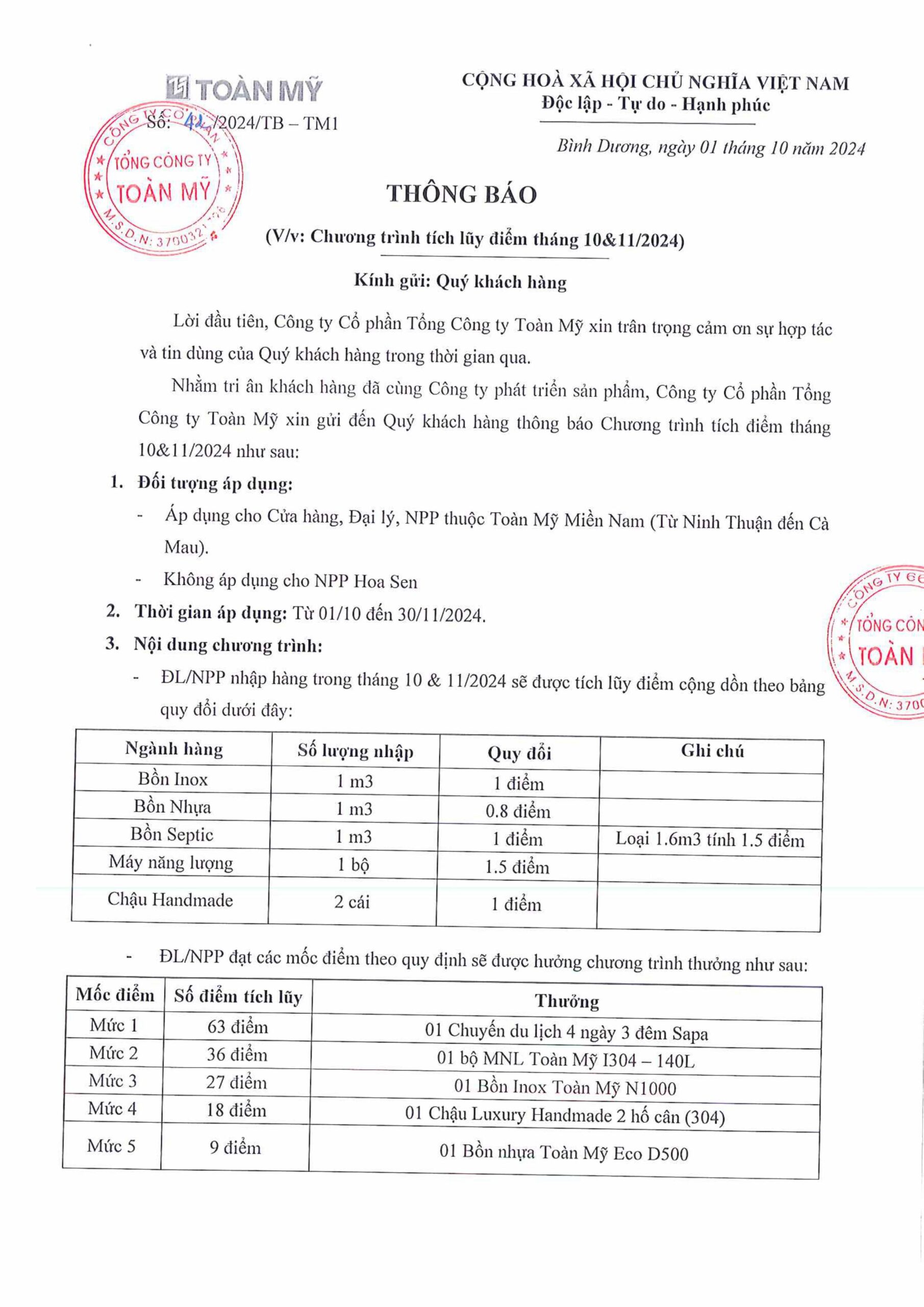 – Thời gian áp dụng: Từ 01/10 đến 30/11/2024.